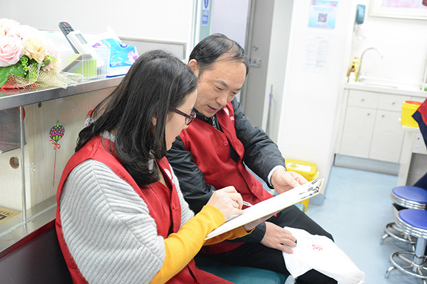 下午16时许,参加义务献血的员工志愿者来到献血地点,在工作人员的引导下,登记信息、测量血压、抽血化验,血液检验合格后开始无偿献血。